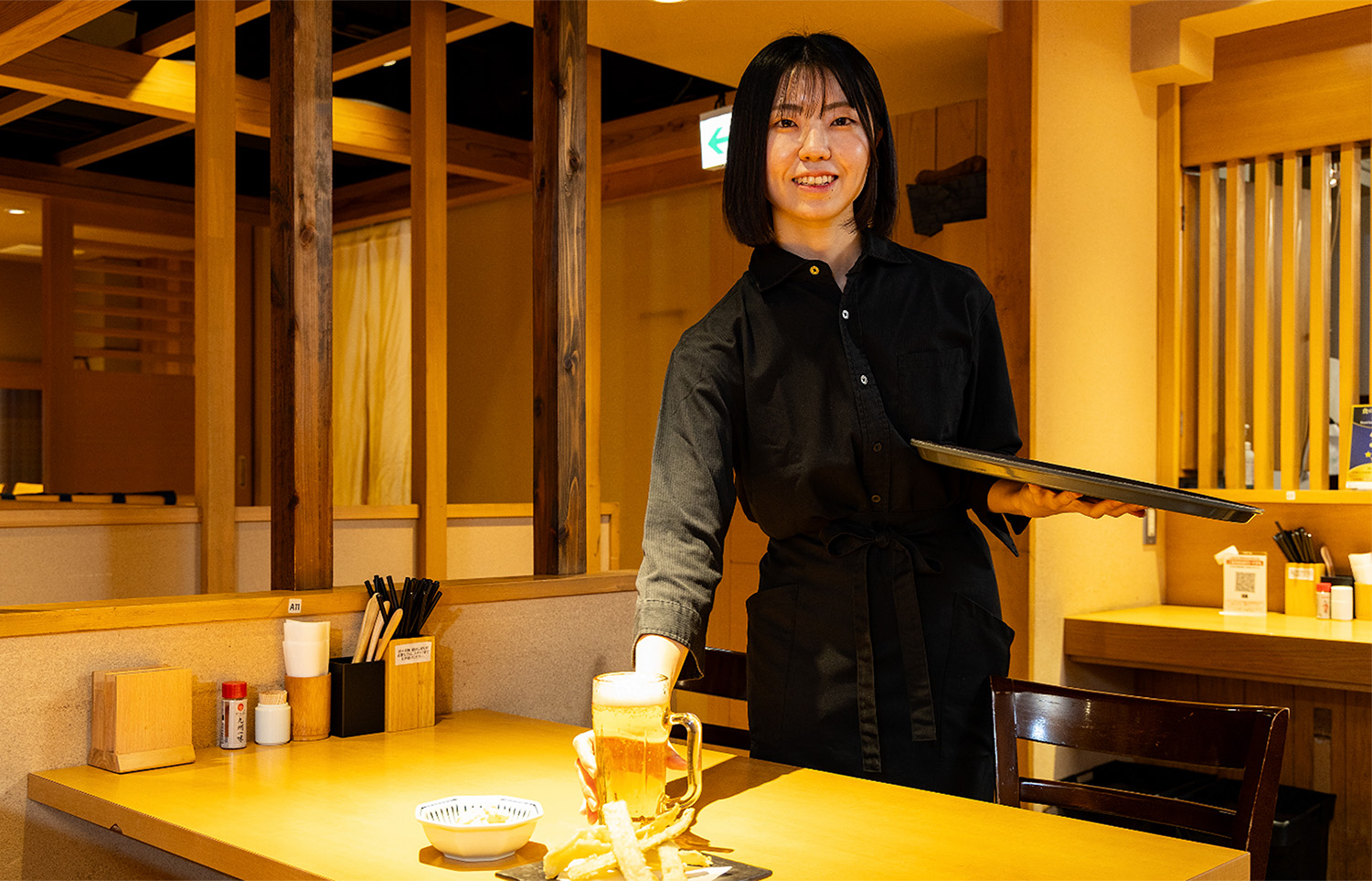 - 現在は昼に賑わう定食業態で働いているので、次は焼き鳥を扱っている夜のお酒を中心とした業態で働いてみたいです。社内研修で何度か焼き鳥を焼かせてもらいましたが、難しいからこそ楽しく、もっと上手に焼けるようになりたいと思っています。 ※クルー:JR九州フードサービスで働くアルバイトスタッフの総称